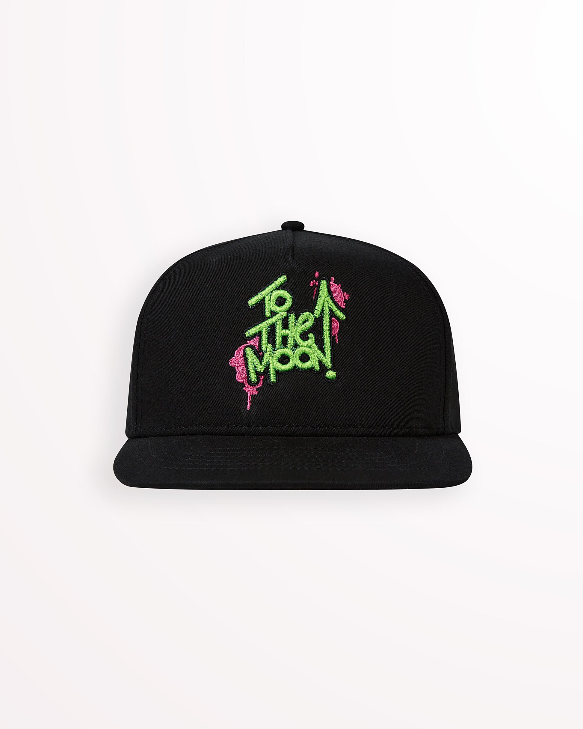 Stand out after dark with the To The Moon® Midnight Black Snapback. Crafted from 100% cotton and detailed with neon graffiti embroidery, this cap is built for culture movers and night riders alike. Featuring our signature logo with paint-splatter accents and a bold back hit, it’s a statement piece from NYC to the Moon.