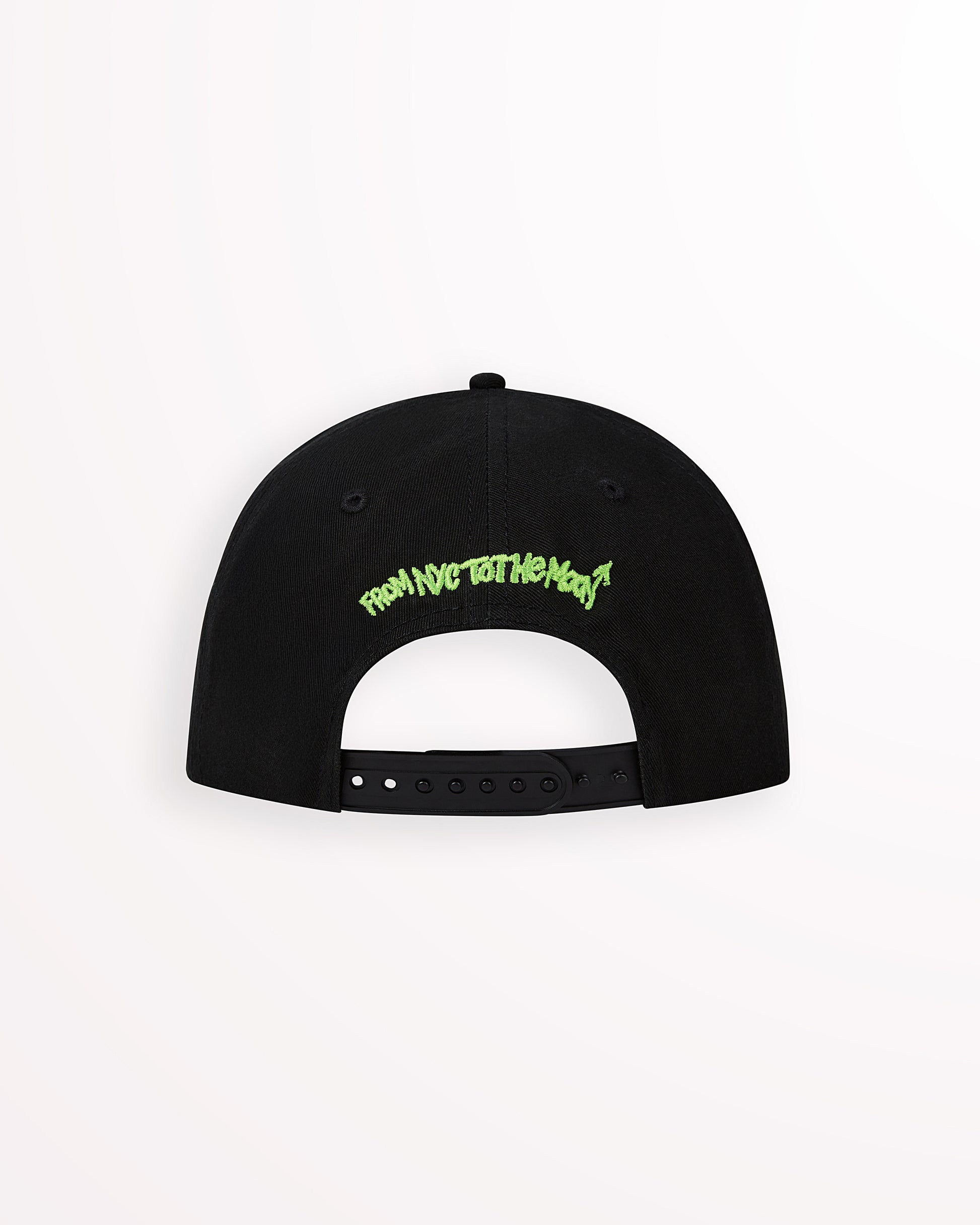 Back: “From NYC To The Moon” embroidered in neon green above the snap closure.